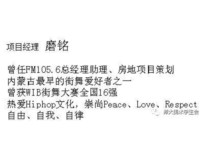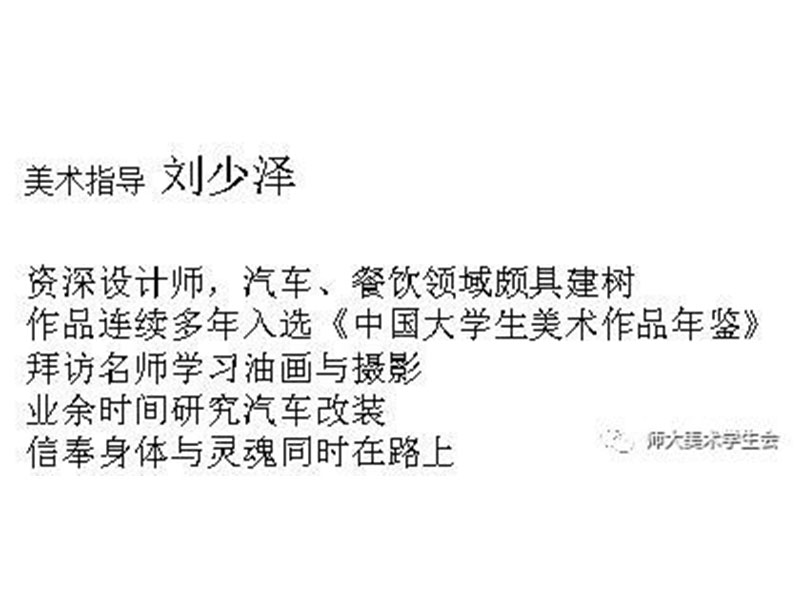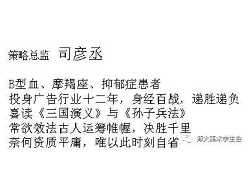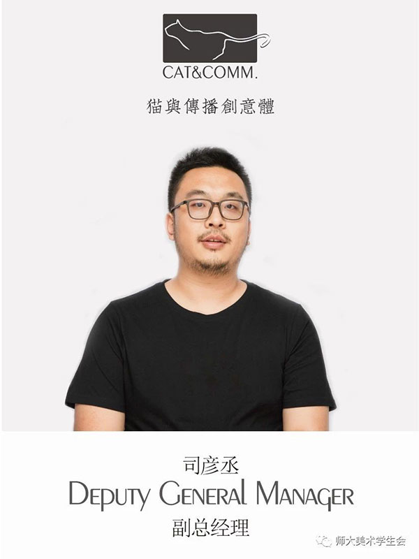 司彦丞老师为猫和公司的策略总监,投身广告行业十二年,经验丰富。美术指导张宝和老师,曾担任德国triumph集团,中国雅芳广告部经理,负责华北区形象统筹把握,曾在北京举办个人画展。为了帮助大学生更好的认识创新创业,老师们将以自身的经历与大家进行思想交流。同为美术指导的刘少泽老师为一名资深设计师,在汽车、餐饮领域颇具建树,作品连续多年入选《中国大学生美术作品年鉴》。项目经理磨铭老师,曾担任FM105.6总经理助理,房地产项目策划。