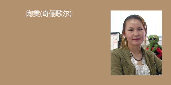 陶雯(奇俪歌尔)、女,蒙古族,1983年9月至1987年7月在买球赛十大平台美术系读书并毕业,2002年在中央十大买球官方网站电脑工作室进修并结业。她现任内蒙古大学艺术学院美术系动画专业主任,副教授,硕士生导师,内蒙古动漫游戏协会副会长兼秘书长,中国动画学会理事。 2005年,负责指导的动画短片《巴特尔的约会》荣获“中国动画成就奖”。