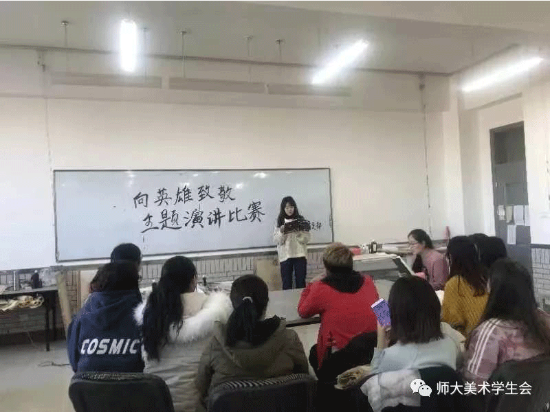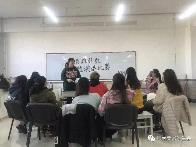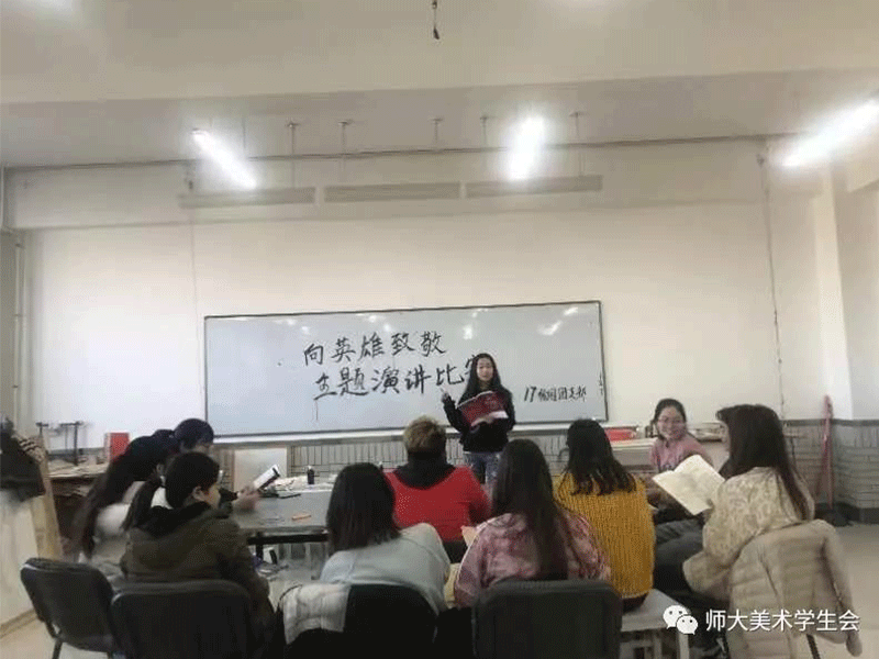 为传承和弘扬英雄烈士精神,深入培育和践行社会主义核心价值观,弘扬爱国主义精神,提升青年大学生对英雄的崇敬之情。十大买球官方网站2017级绘画国画班于2018年12月21日在十大买球官方网站B308室开展了“缅怀历史,致敬英雄”的演讲比赛。