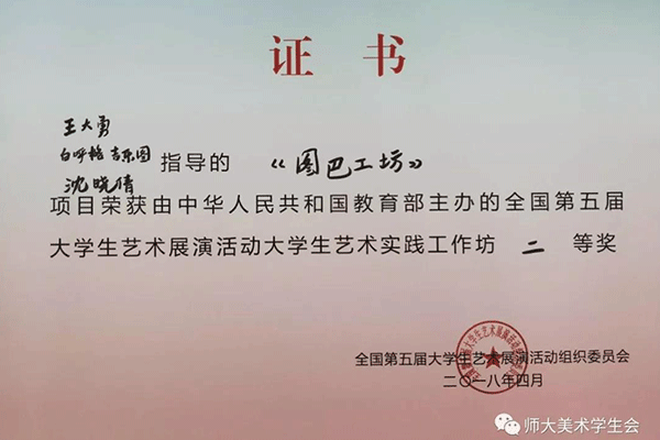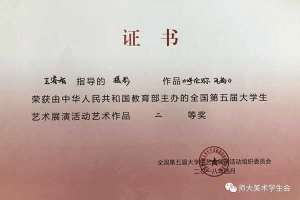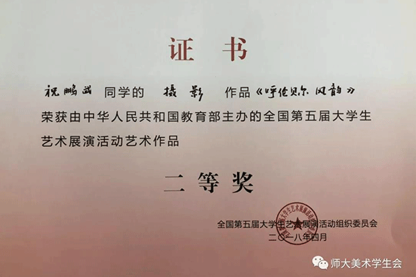 我院学子积极参加自治区第五届大学生艺术展演,并取得优异成绩。 我院共有两件作品获奖。其中,王睿志老师指导的2014级祝鹏武摄影作品《呼伦贝尔风韵》获艺术作品类二等奖;由王大勇、白胡格吉乐图、沈晓倩三位老师指导的《图巴工坊》项目荣获大学生艺术实践工作坊二等奖;同时,四位老师也获得了优秀指导教师奖。
