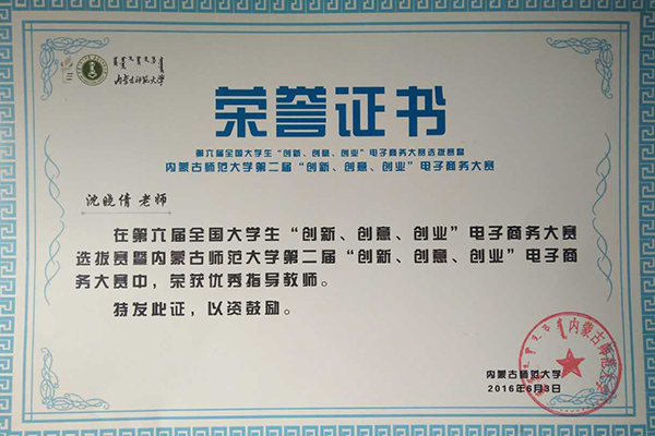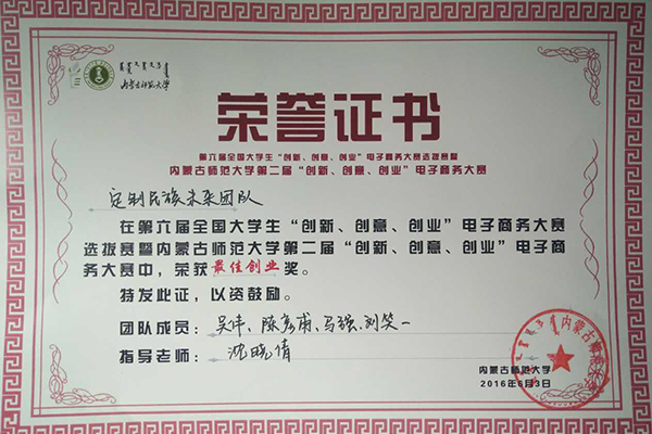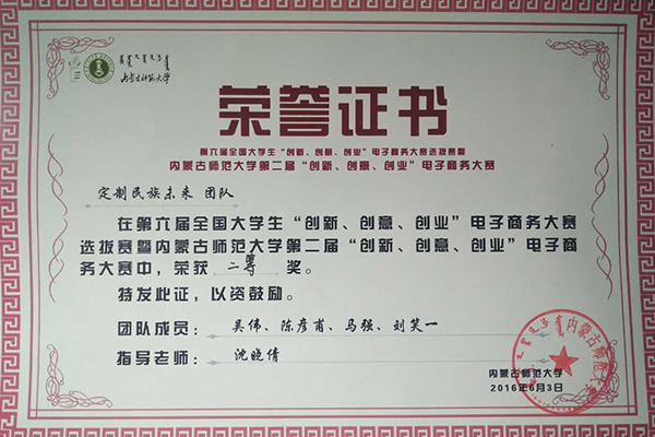 为激发大学生兴趣与潜能,培养大学生创新意识、创意思维、创业能力以及团队协同实战精神,2016年6月3日,十大买球官网举行了第六届全国大学生“创新、创意、创业”电子商务大赛选拔赛暨买球赛十大平台第二届“创新、创意、创业”电子商务学科性竞赛,由我院13级环境设计专业吴伟、14级产品设计专业陈彦甫、马强和公共管理学院刘笑一组成的定制民族未来团队作品——图巴工艺美术坊(私人订制特色民族工艺品销售网站)荣获最佳创业奖和集体二等奖,指导老师沈晓倩荣获优秀指导教师。定制民族未来团队将作为学校代表队之一参加自治区级比赛。