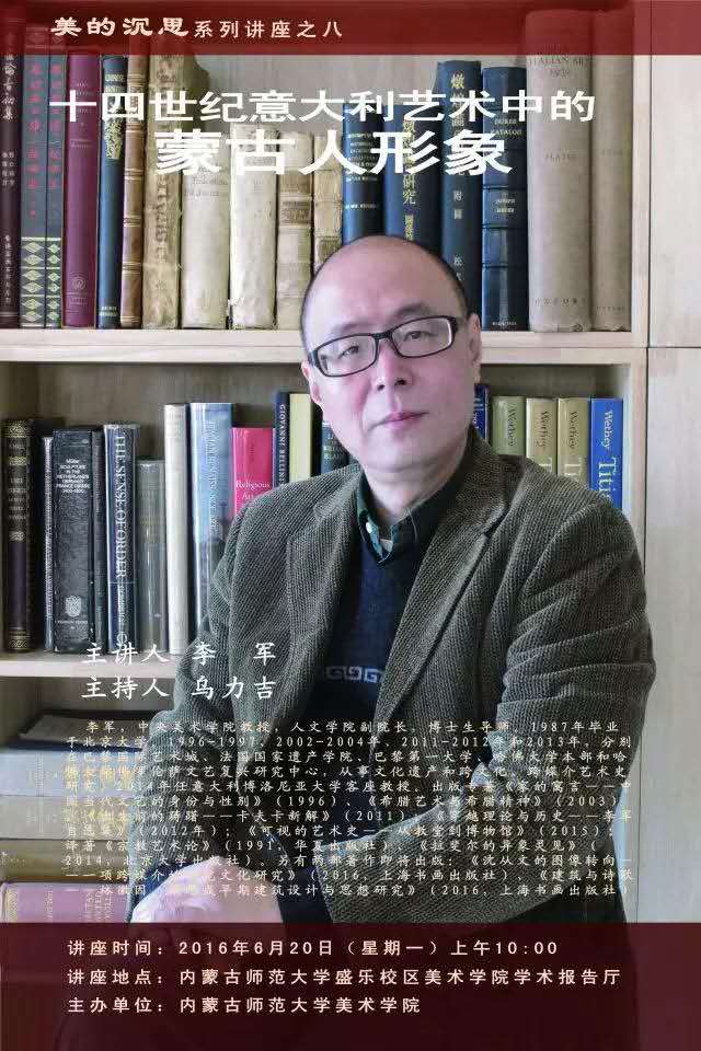 6月20日上午10:00,由十大买球官方网站主办的“美的沉思”系列讲座之八——十四世纪意大利艺术中的蒙古人形象在十大买球官方网站二楼学术报告厅举行。本次讲座由中央十大买球官方网站人文学院副院长、博士研究生导师李军教授担任主讲,十大买球官方网站乌力吉院长主持讲座。