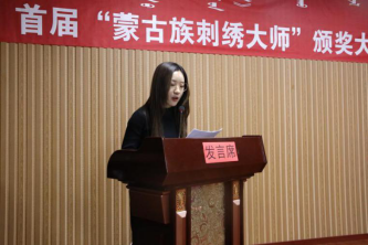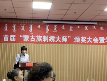 颁奖仪式结束后,科右中旗人大常委会主任白晶莹代表发言,(见图4)她强调:“本次大会能够在科右中旗举办,对蒙古族科右中旗刺绣产业蓬勃发展和关怀的同时,也让我们更加坚定了产业发展的信心,更加坚定了蒙古族刺绣文化遗产和带动脱贫攻坚的重任。同时为我们提供学习交流的平台,向专家同仁互相探讨学习经验。希望专家学者提出宝贵意见,为刺绣产业发展注入活力。依托蒙古族刺绣带动科右中旗农牧民脱贫增收,并在实践中总结出了统一培训、统一增收、统一结算、统一管理的产业运行模式, 带动了全旗82名大学生创业就业,为科右中旗辖区12个苏木镇、172个嘎查农牧民开展蒙古族刺绣义务培训。先后培养出14573人,其中一级绣工1300余人,二级绣工5000余人,三级绣工8000余人,2895个建档立卡成功户,实现了年收入增长了2000元以上。超过了2万人参与到科右中旗蒙古族刺绣产业中,产业推动自主创业,自主研发蒙古族刺绣1042种,其中包括服饰、家具、儿童系列等。”