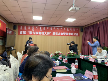 会议由内蒙古农业大学学教授、内蒙古蒙古族刺绣传承创新学会副会长郑宏奎主持。参会的领导及来宾有自治区人大常委会教科文卫工作委员会主任孟根其其格,内蒙古社科院副院长毅松,内蒙古社科院二级研究员、中国蒙古学学会副会长包斯钦,内蒙古文旅厅非遗处副处长刘佳,内蒙古社科院《蒙古学研究年鉴》主编、中国蒙古学学会副秘书长包红梅,内蒙古农业大学副教授、内蒙古蒙古族刺绣传承创新学会秘书长刘娜;中共兴安盟委委员、宣传部长呼和,兴安盟人大工委常务副主任佟布林,兴安盟人大工委教科文卫工作处处长陈桂华;中共科右中旗委副书记、政府旗长郭堂,科右中旗人大常委会主任白晶莹,科右中旗人大常委会常务副主任斯日古冷,科右中旗宣传部常务副部长陈丹等人。此外,还有获得奖项的十位蒙古族非遗刺绣大师。其中,八位亲临现场,她们分别是:科右中旗的白晶莹、锡林郭勒盟苏尼特左旗的乌云毕力格、通辽市的包阿喜玛、呼和浩特市的乌仁其木格、巴彦淖尔市乌拉特中旗的孟和其其格、赤峰市翁牛特旗的阿拉坦琪琪格、阿拉善盟阿拉善左旗的陶格日乐、呼伦贝尔市陈巴尔虎旗的阿拉坦古日古台。(见图3)