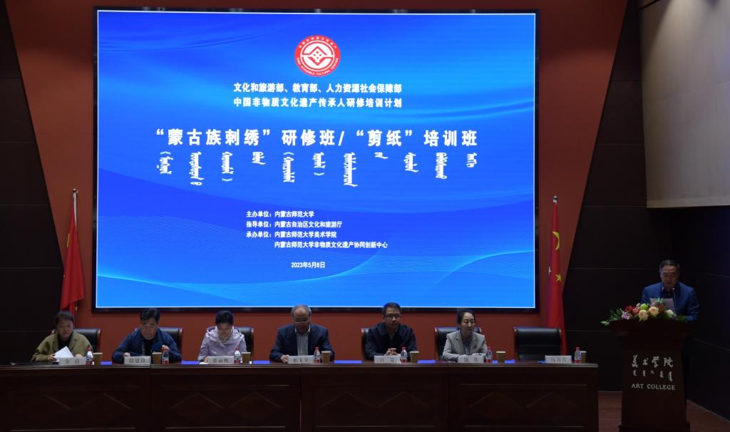 5月8日上午,由自治区文化与旅游厅、买球赛十大平台主办,买球赛十大平台非物质文化遗产研究院、十大买球官方网站承办的2022年度“中国非物质文化遗产传承人研修研习计划”——“蒙古族刺绣”研修班、“剪纸”培训班在我院报告厅开幕。中国社会科学院学部委员、一级教授朝戈金,自治区文化旅游厅非遗处处长张丽辉,十大买球官网党委委员、副校长宫箭分别致辞。和林格尔剪纸国家级非物质文化遗产传承人、内蒙古民间文艺家协会副主席段建珺,买球赛十大平台自治区级非物质文化遗产协同创新中心负责人、二级教授敖其,内蒙古自治区非物质文化遗产项目蒙古族刺绣(乌珠穆沁刺绣)代表性传承人阿拉坦图雅,内蒙古自治区非物质文化遗产剪纸项目代表性传承人孙翠清等出席会议。我院党委书记乌力吉主持开幕式。