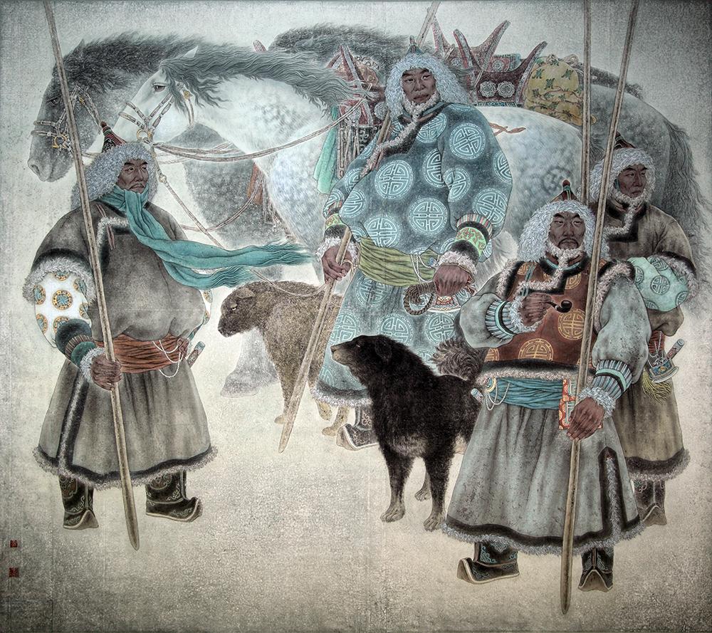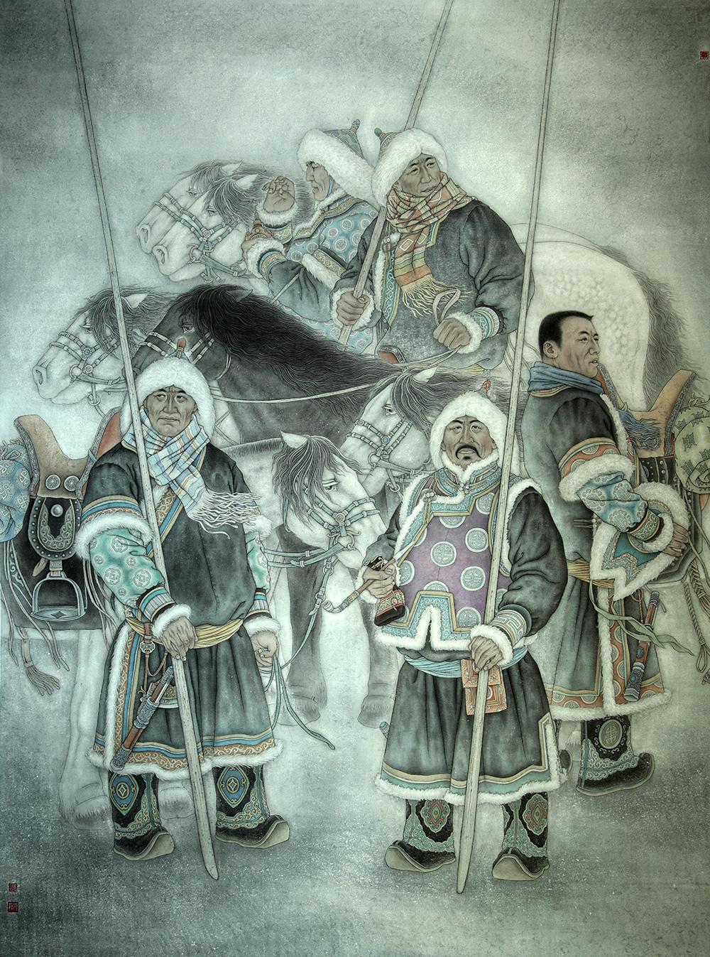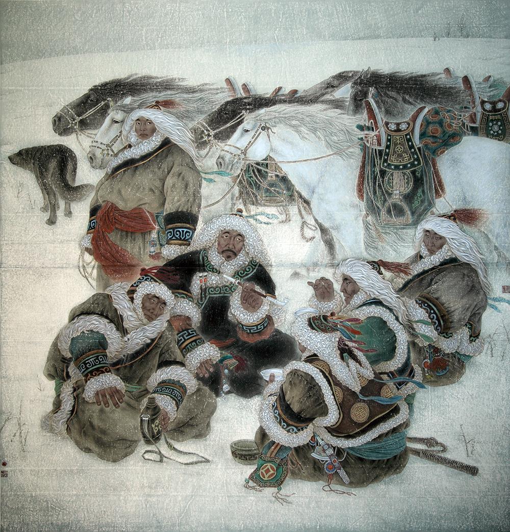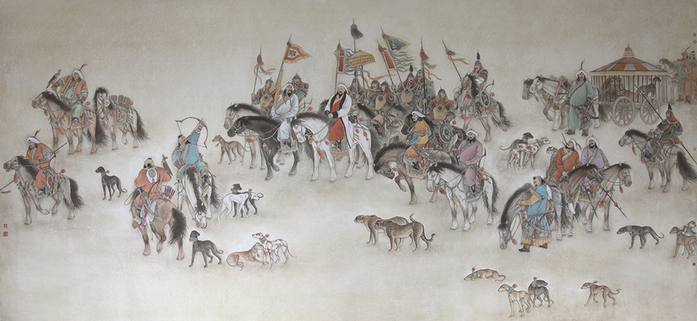 4、2010年,独立创作完成《内蒙古自治区重大历史文化题材美术创作项目》之一《忽必烈狩猎图》